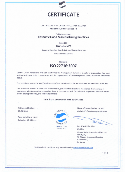 Выпускаемая "Камелия НПП" продукция и система контроля качества на предприятии соответствуют международной системе GMP стандарта ISO 22716:2007.